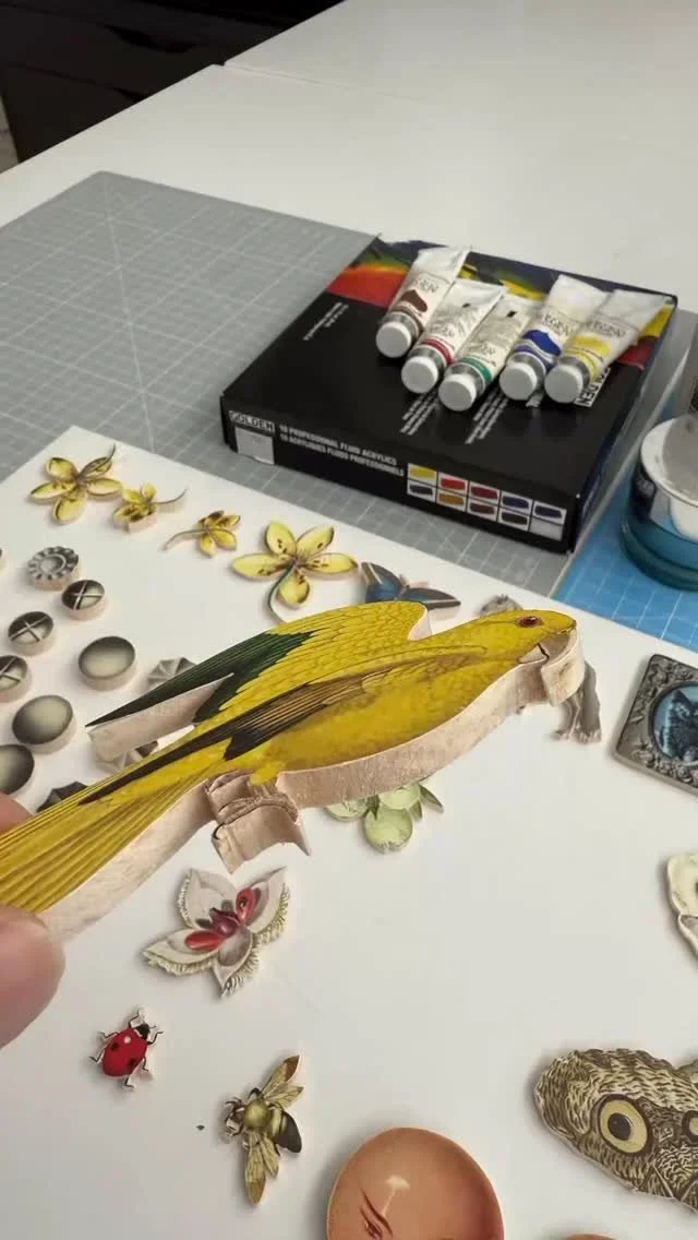 With its unique approach to collaging, her artwork intertwines fragments of vintage ephemera, often with reference to film and TV, to spin bizarre and dreamlike tales. Her work takes the form of large-scale originals and limited edition prints. Notable series have included: Pin-ups, Landscapes, Film Stills and 3D Box Collages.