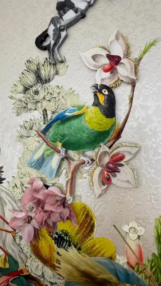 With its unique approach to collaging, her artwork intertwines fragments of vintage ephemera, often with reference to film and TV, to spin bizarre and dreamlike tales. Her work takes the form of large-scale originals and limited edition prints. Notable series have included: Pin-ups, Landscapes, Film Stills and 3D Box Collages.