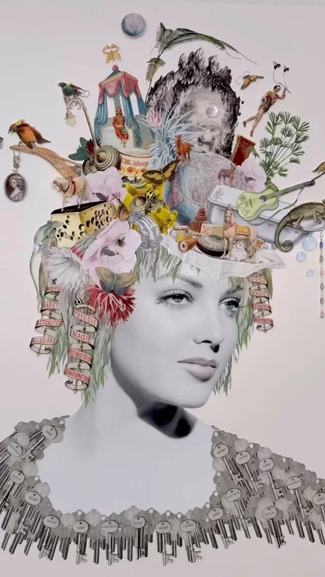 With its unique approach to collaging, her artwork intertwines fragments of vintage ephemera, often with reference to film and TV, to spin bizarre and dreamlike tales. Her work takes the form of large-scale originals and limited edition prints. Notable series have included: Pin-ups, Landscapes, Film Stills and 3D Box Collages.