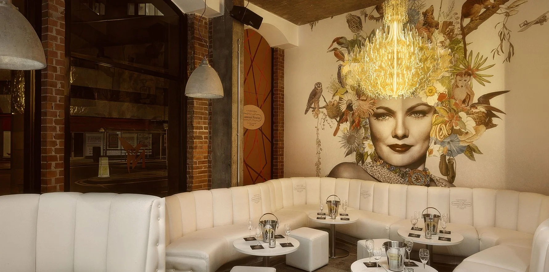 In the latest collaboration with contemporary collective House of Artists, Maria has been commissioned to fill a single wall of 53 Degrees North / Laurent Perrier in Leeds. A stunning backdrop to the bar's VIP area, Eliza adds exquisite colour to the iconic space.