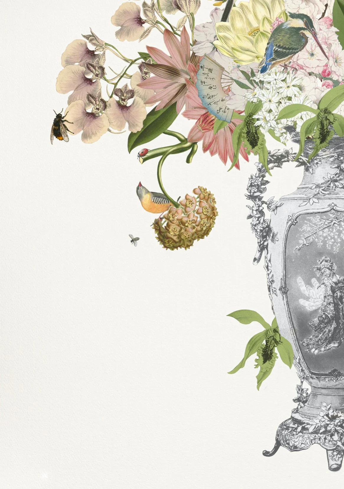 ‘The Splendour of Peace’ is Rivans’ response to the recent turbulent times we have been experiencing – and a reminder of how beautiful peace can be. Transporting us to the serenity of a Japanese garden, you can almost smell the jasmine and cherry blossom; can almost hear the hum of birds, beasts, and bees, the tinkling of teapots, and the giggle of geishas. Set into an antique polished silver vase, the modern collage merges with the traditional still life, inspired by the Dutch Masters: there’s a buzz and a vibrancy, but there’s equilibrium here too, creating a deep and meditative sense of calm that promises to soothe the soul and promote inner peace.